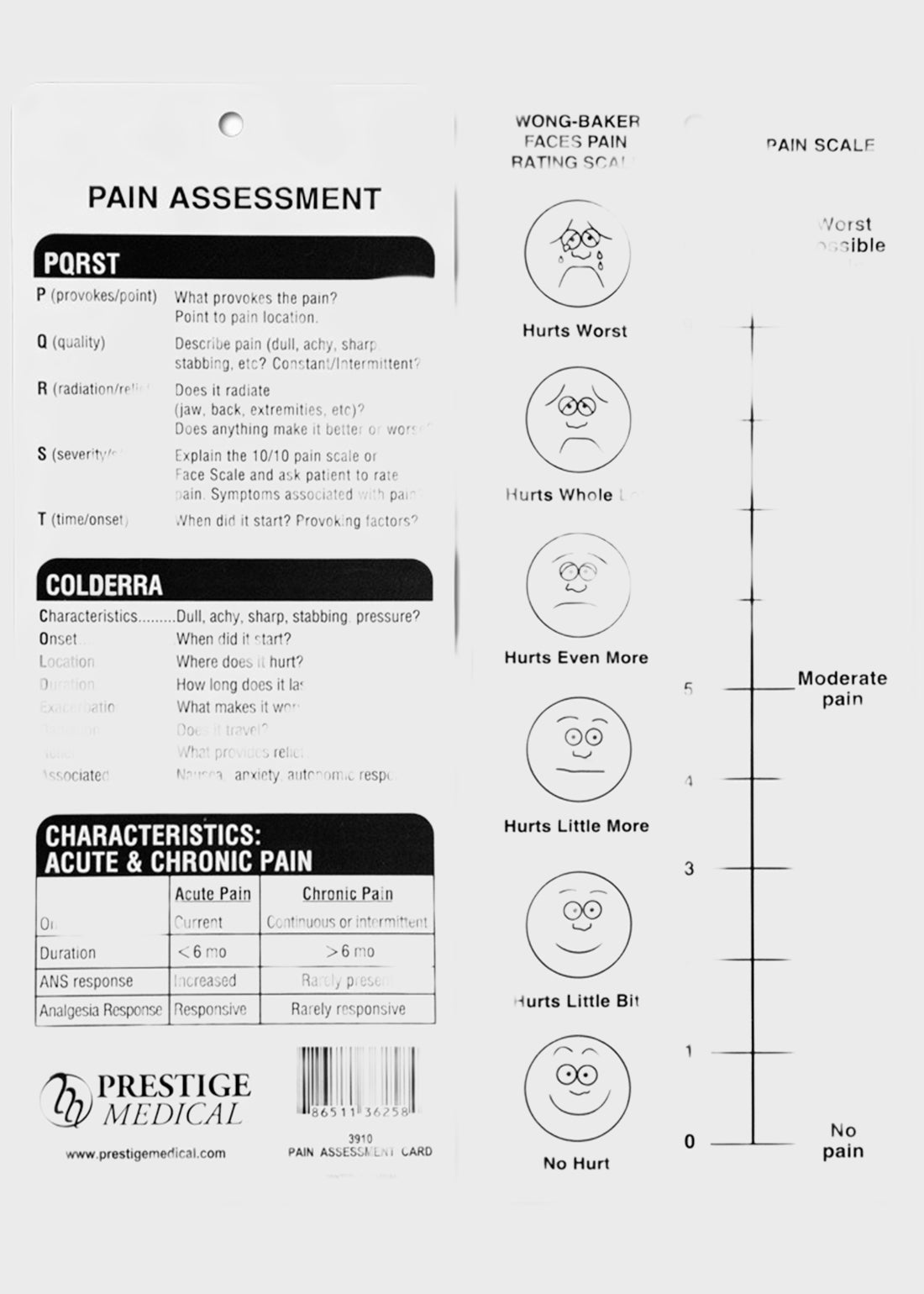 Prestige presents this Pain Assessment Card that has Wong-Baker Faces for pain rating scale. It includes PQRST and COLDERRA pain assessment descriptions. Card dimensions: 18cm x 7cm
