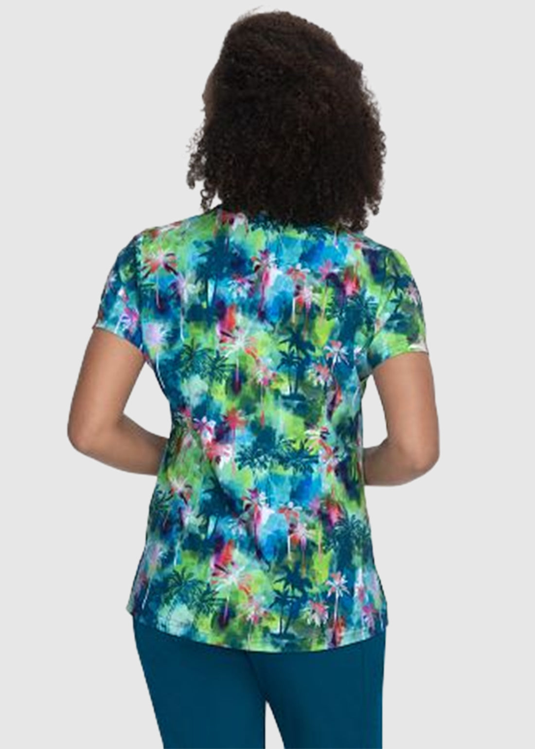 Planet koi Isla Palm Oasis Women's 2-Pocket Print Scrub Top combines style and functionality with a contrast v-neck, three front pockets for storage, and side slits for ease of movement. Crafted from eco-friendly materials, it's a sustainable and comfortable choice for your workday.