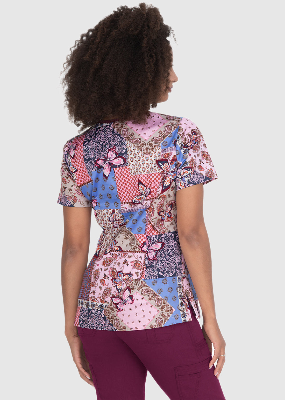 Stretch Hali Mariposa Bandana Women's Scrub Top from Koi Stretch offers a blend of comfort and functionality. Designed with a modern fit, it features a mock-wrap neckline with contrast trim, adding a stylish touch to your work attire. The top includes two patch pockets for convenient storage of essentials. Crafted from a stretch fabric, it ensures ease of movement throughout your day. Available in the "Mariposa Bandana" print, this scrub top combines practicality with a fashionable flair.