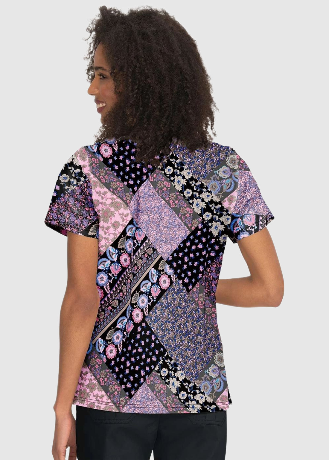 koi Stretch Luisa Meadow Patchwork Women's 4-Pocket Heart-Shaped Neck Print Scrub Top offers a stylish heart-shaped neckline and practical design with two front pockets and two side pockets. The side slits ensure comfort and ease of movement, making it a perfect addition to your work wardrobe.
