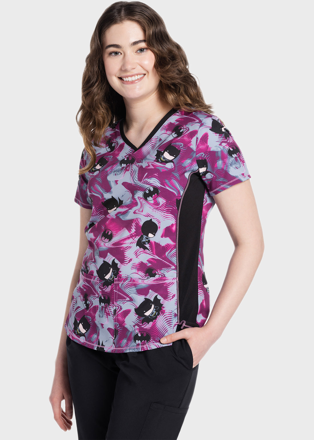 This Contemporary fit v-neck top has a contrast color neckband and side panels. There are front and back princess seams plus two front patch pockets. Other features include side vents and a shirttail hem. Center back length: 26".