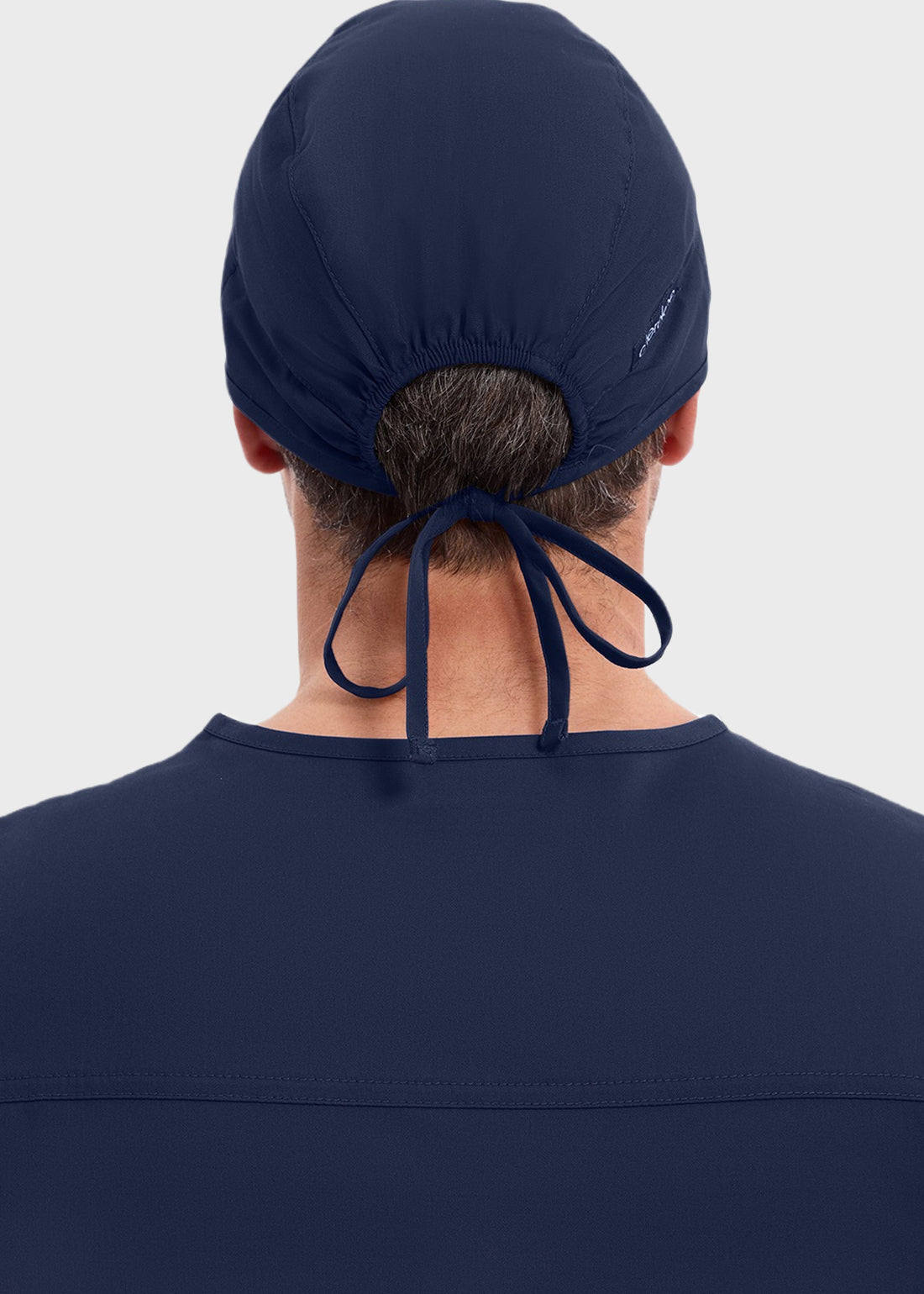 This adjustable, tie-back scrub hat feature a terry cloth sweatband and contoured seaming with back elastic for better fit.