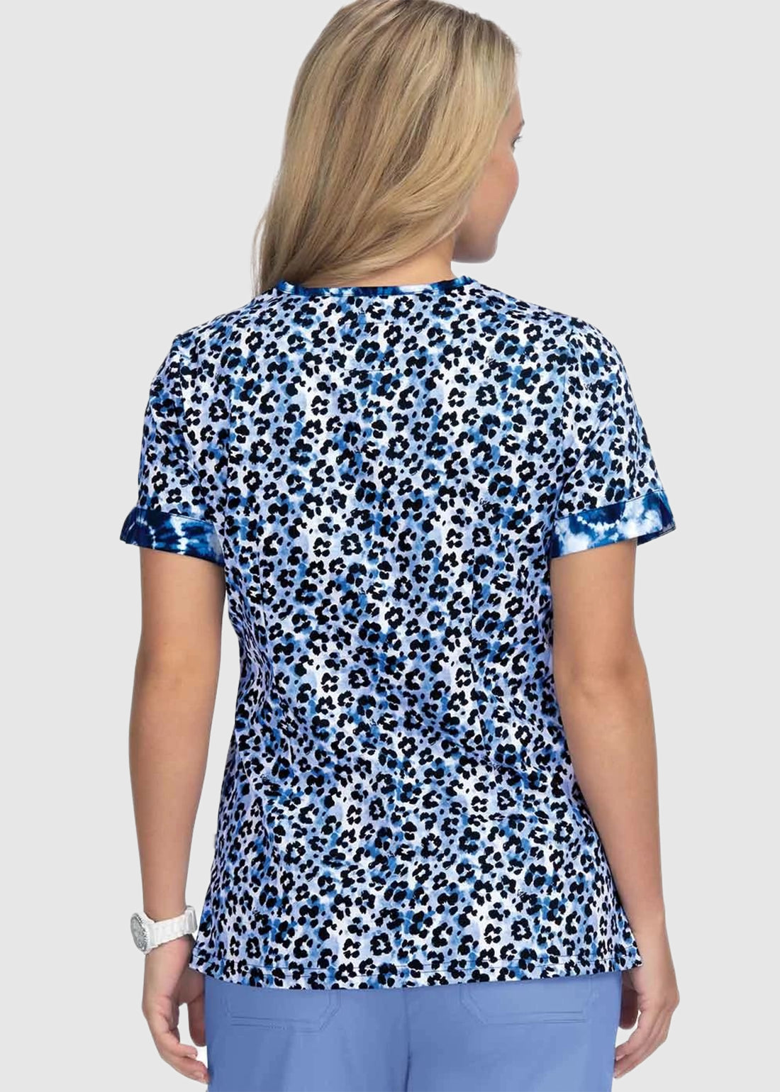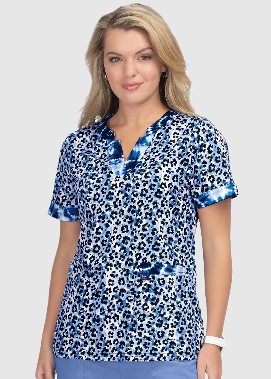 Koi Stretch Elena Women's Tie Dye Leopard Blue Split-Neck Print Scrub Top
