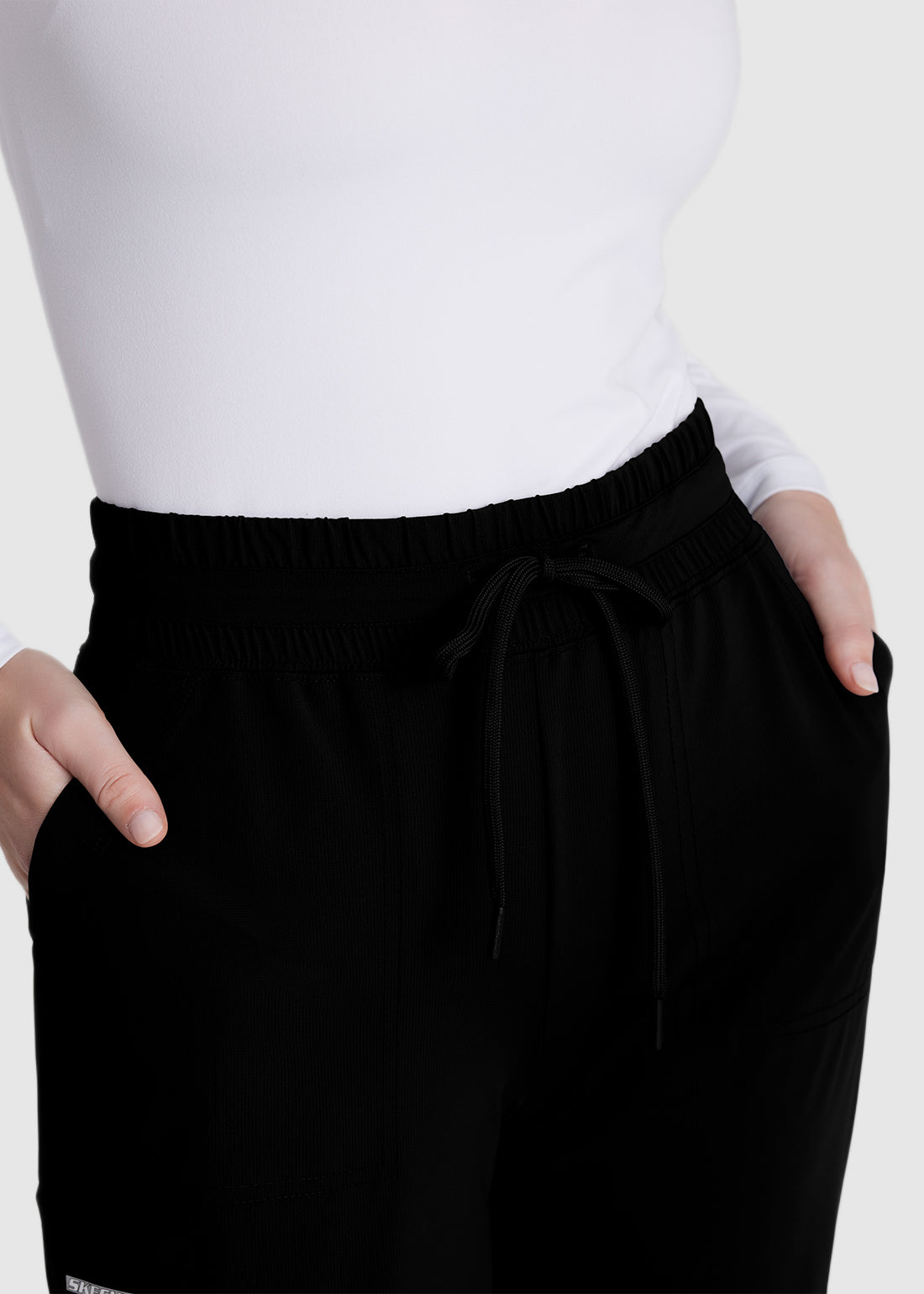 Skechers Reach Shirred Waistband Slim and Straight Pant combines comfort and style with a shirred elastic waistband and tunneled drawcord. Designed for functionality, it features four pockets, including slanted front pockets with shadow topstitching, a welt cargo pocket, and a back pocket.