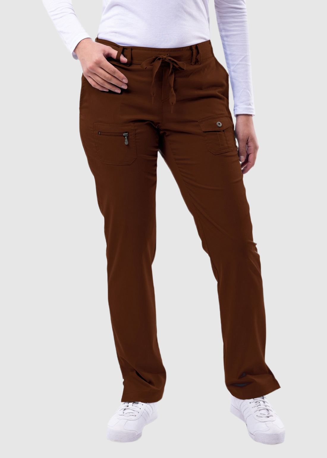 Style yourself comfortable in Pro by Adar Women's Slim Fit Utility Scrub Tall Pant. The modern pants feature an adjustable waist and belt loops at waistline. The zippered side cargo pocket, two front slit pockets, additional snap cargo pocket, two back snap pockets and side vents at hem make it ideal for your work and lounging.