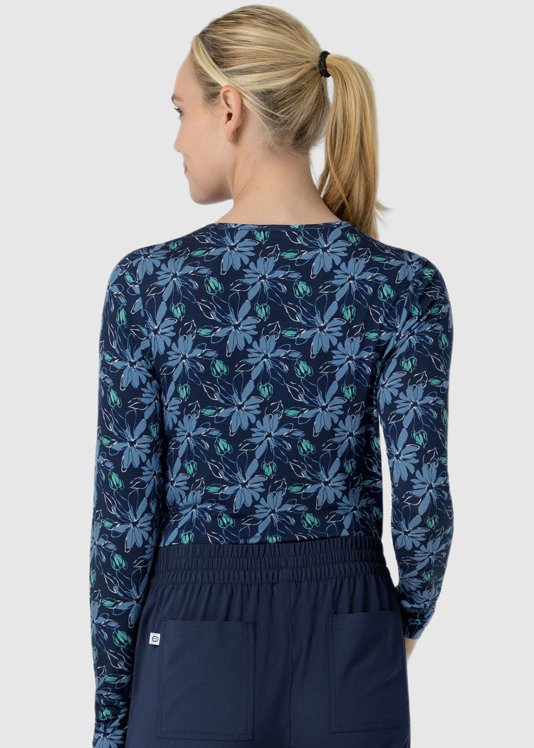 Wink Scrubs Women's All-over Print Silky Tee in Beachy Blooms Navy brings a stylish touch to your workwear with its vibrant allover print. Designed with a classic crewneck and long sleeves, this silky soft, lightweight rayon jersey tee offers all-day comfort and a polished look.