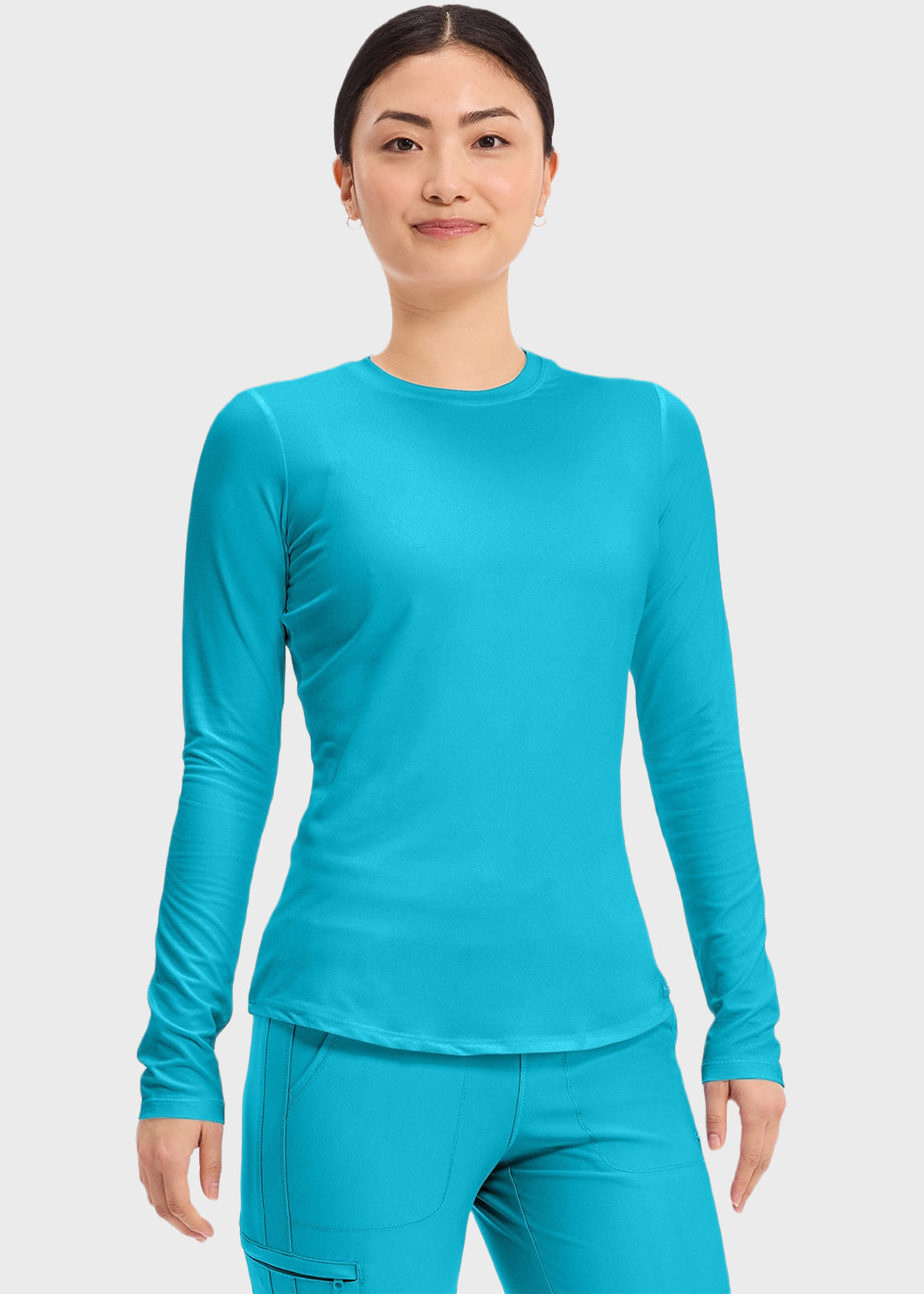 Layer up in style with the Cherokee Basics Long Sleeve Underscrub Knit Tee. Perfect for adding warmth without bulk, the classic crew neck tee is a must-have. Whether worn under scrubs or on its own, its stylish shirttail hem ensures a polished look that’s both practical and chic.