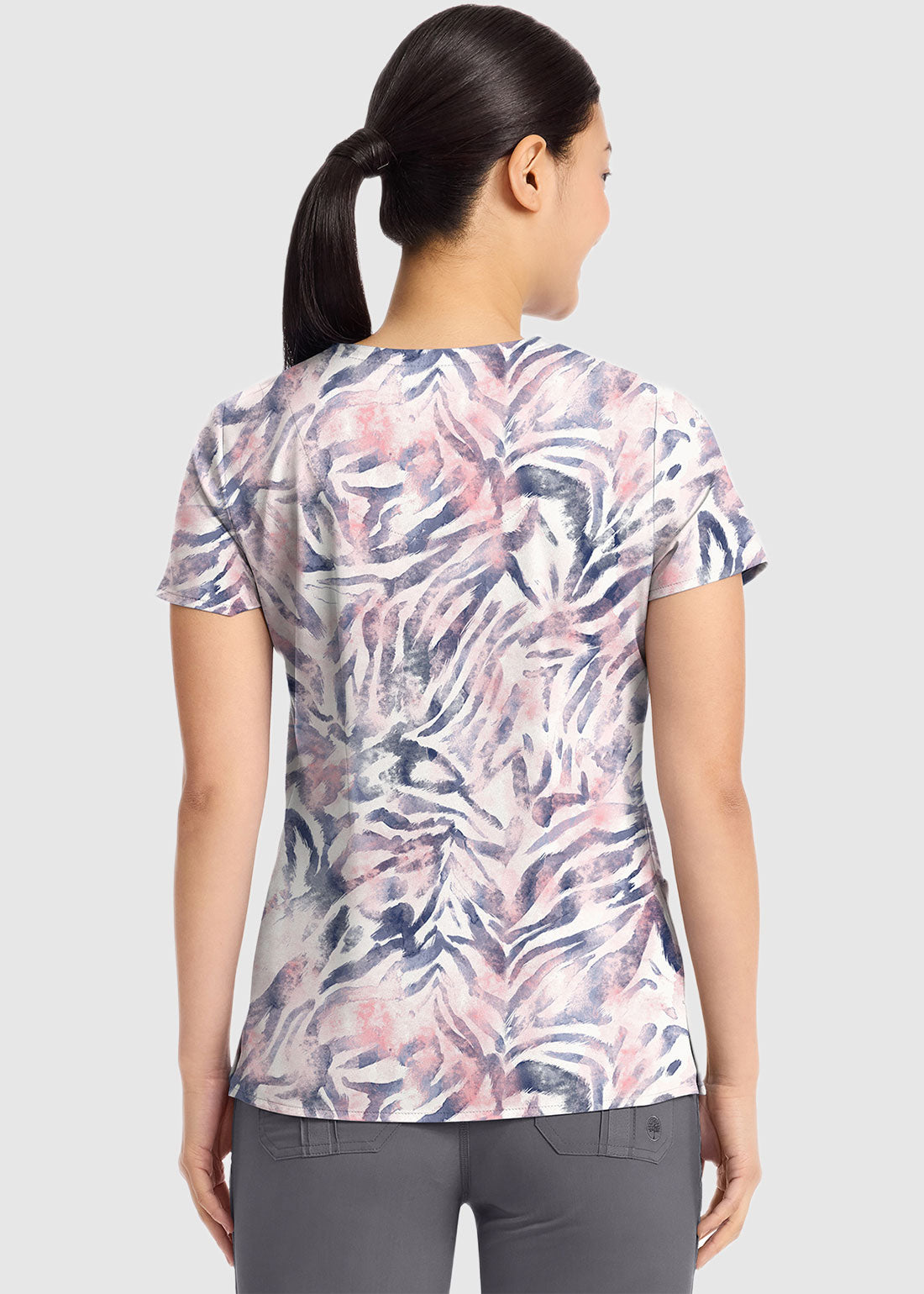 Printed V-Neck Top features contrast grosgrain ribbon, 2 patch pockets and 1 media pocket. Back body darts lend to the flattering fit that this top offers.