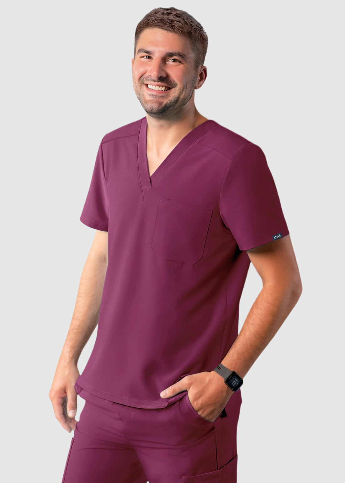 Make an impression at work in Adar A6006 Men’s Contemporary Fit V-Neck Scrub Top. The sleek design paired with pleated back detail and the side vents enhances performance. With forward shoulder and back yoke seam, and ADAR brand icon, the top is a must have.