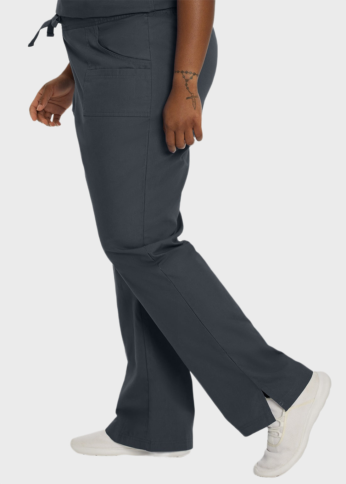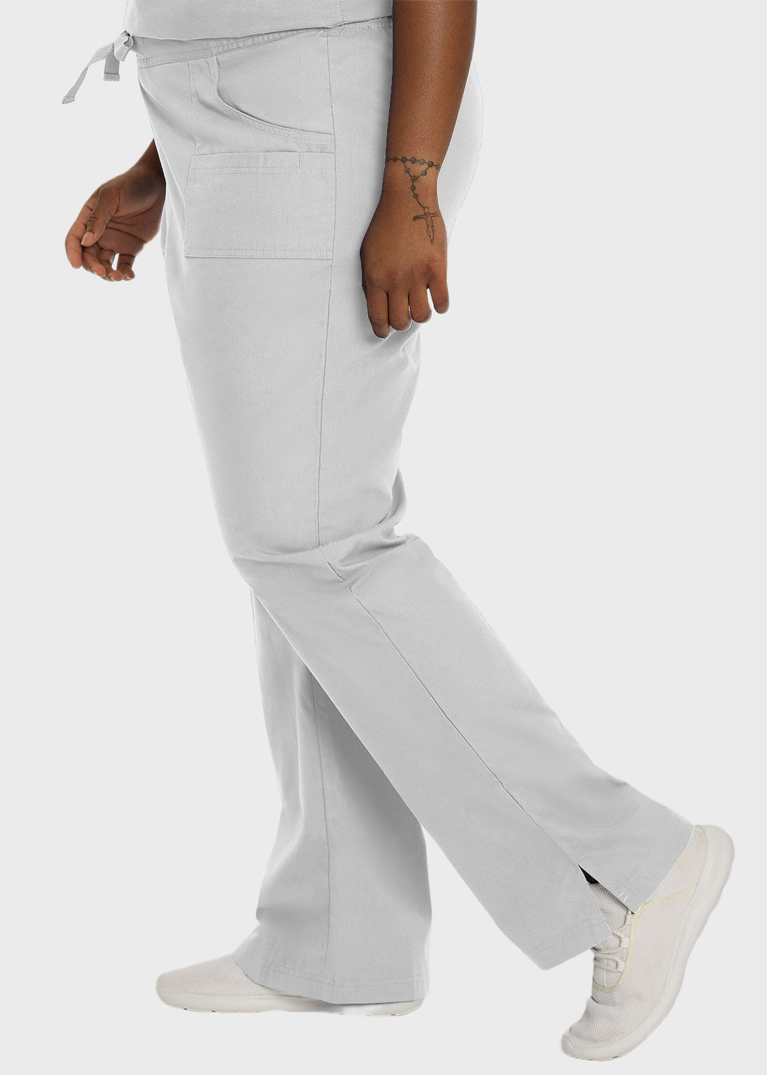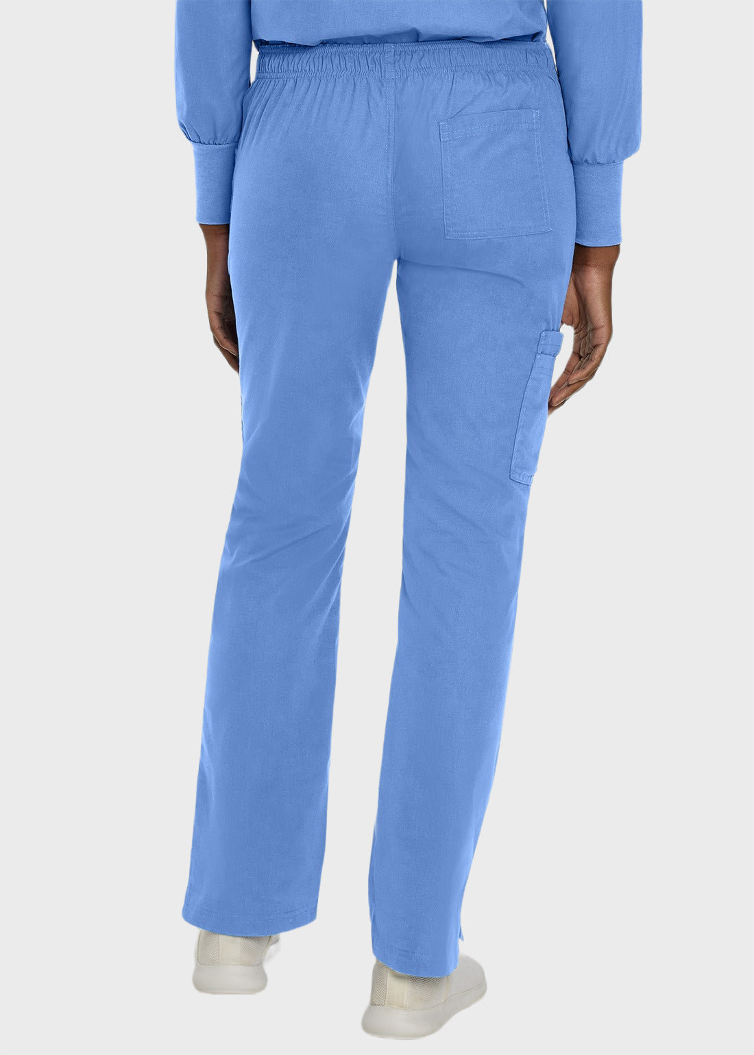 - Mid-rise 50/50 drawstring front, elastic back scrub pant