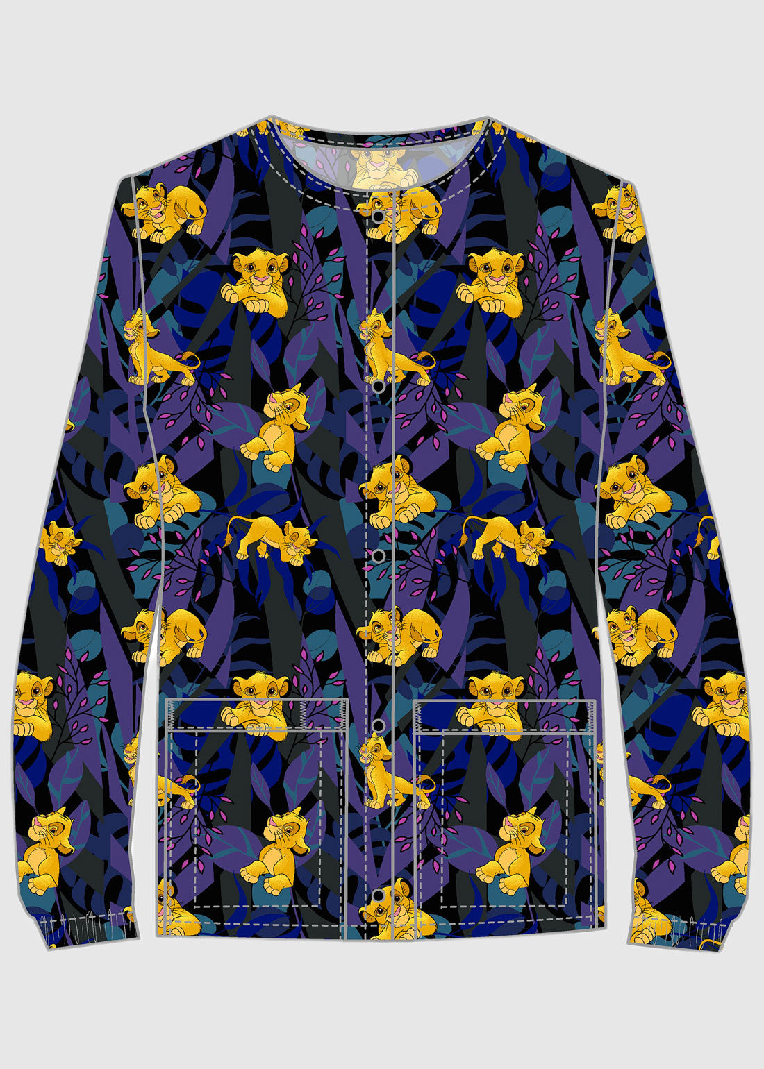 Cherokee Licensed Print Button Up Unisex Jacket in Sensational Simba Bring playful charm to your day with the Sensational Simba snap-front jacket. This modern classic unisex style features two spacious front pockets and a comfortable fit, perfect for layering with personality.
