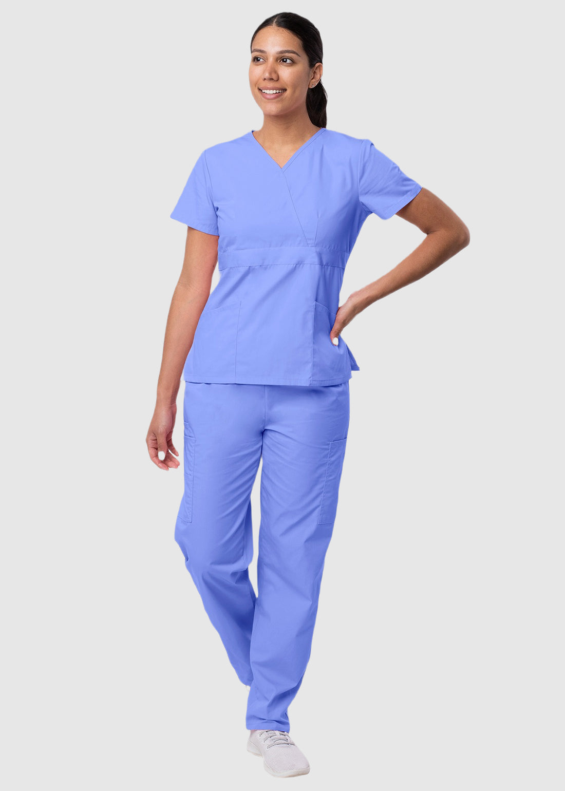 Get the performance you long for with Adar Sivvan Womens Mock Wrap Top And Cargo Pant Scrub Set. The modern top comes with mock wrap neck binding, empire midriff waist, side vents for ease of movement and two large slant pockets for your everyday needs. With wide comfort full elastic waistband with inner drawstring and four pockets: two large cargo pockets, cell phone pocket, and extra scissor pocket on right, the scrub set is a must have.