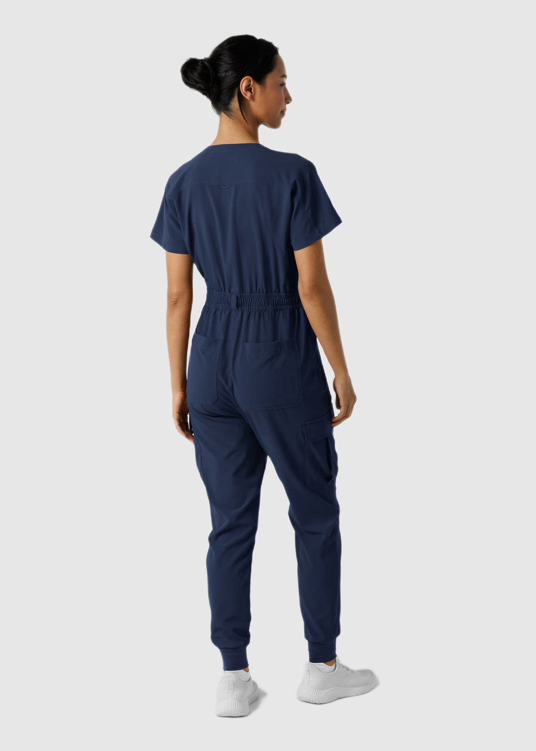 Step into style and comfort with the RENEW Women's Cargo Jogger Scrub Jumpsuit! This modern-fit jumpsuit features front zip pockets, chest pocket with pen slot, snap-button cargo and back pockets, and a drawcord on the elastic waist. With jogger-fit legs and knit cuffs, it’s designed for both function and flair.