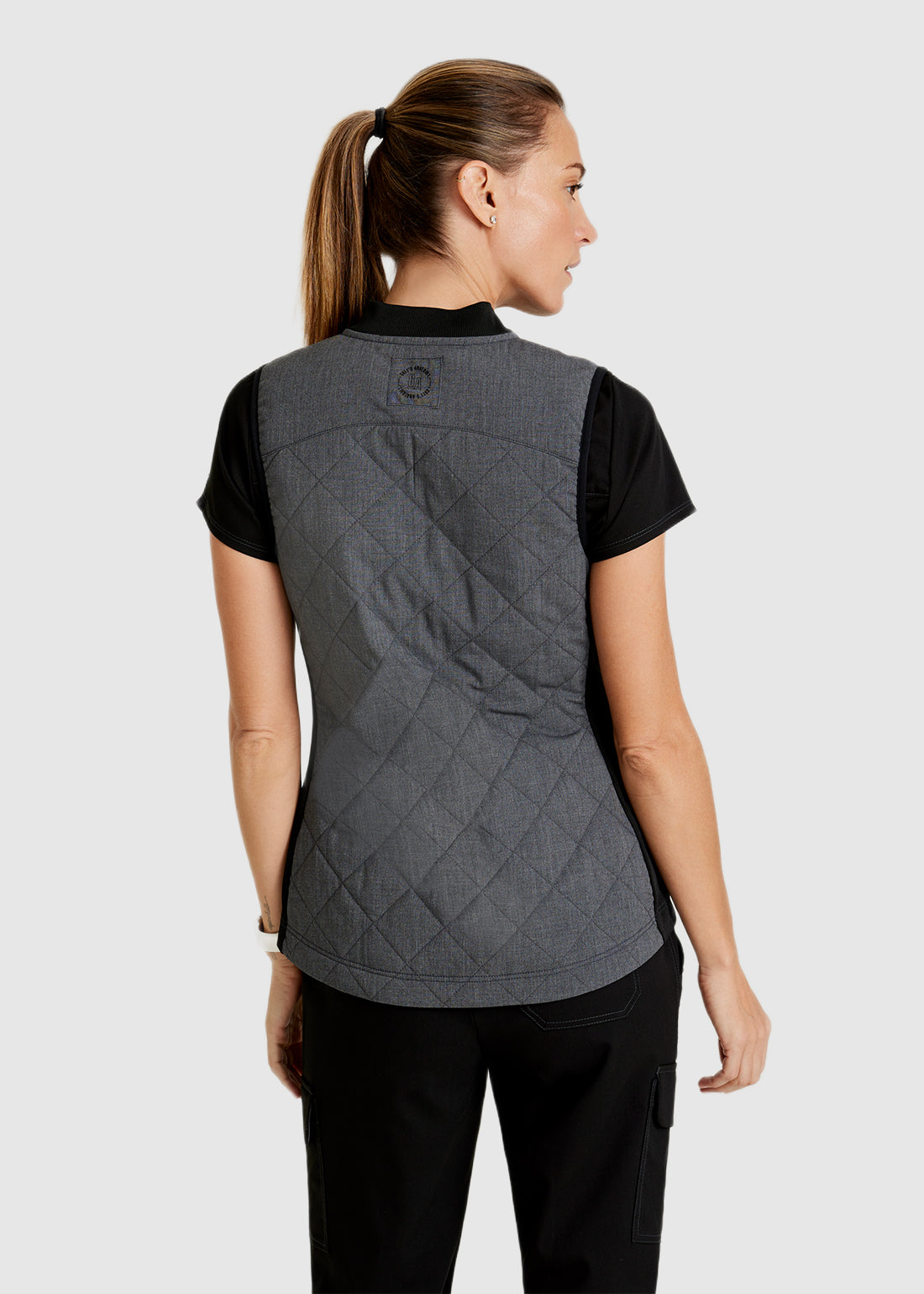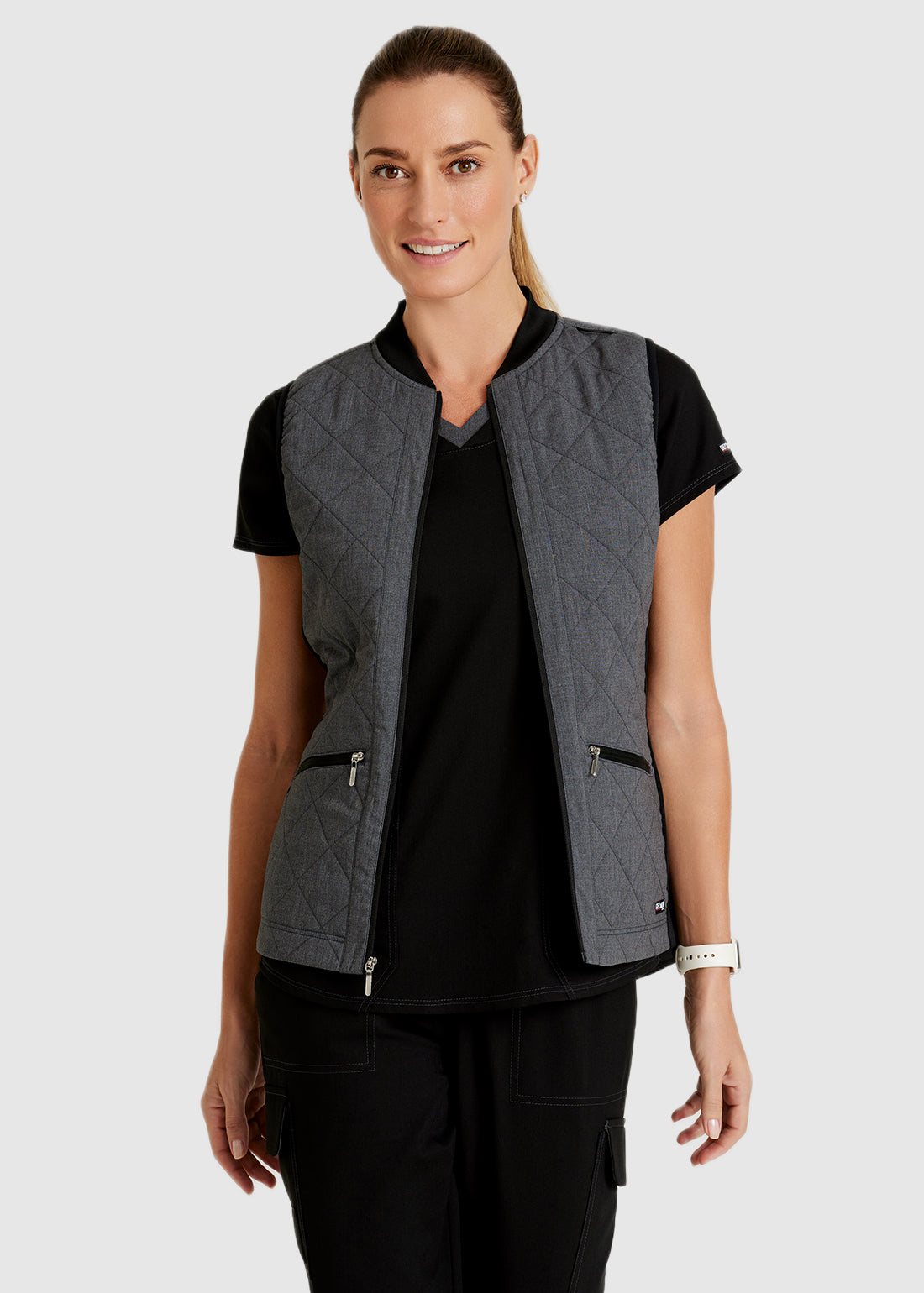 GRSV845Look fashionable and express your style with Two-Tone Cristina 2-Pocket Quilted Zip-Front Vest. The vest features a rib knit neckband and side panels for an alluring look. Completed with two pockets, badge loop and full zip front, the vest is great value for money.