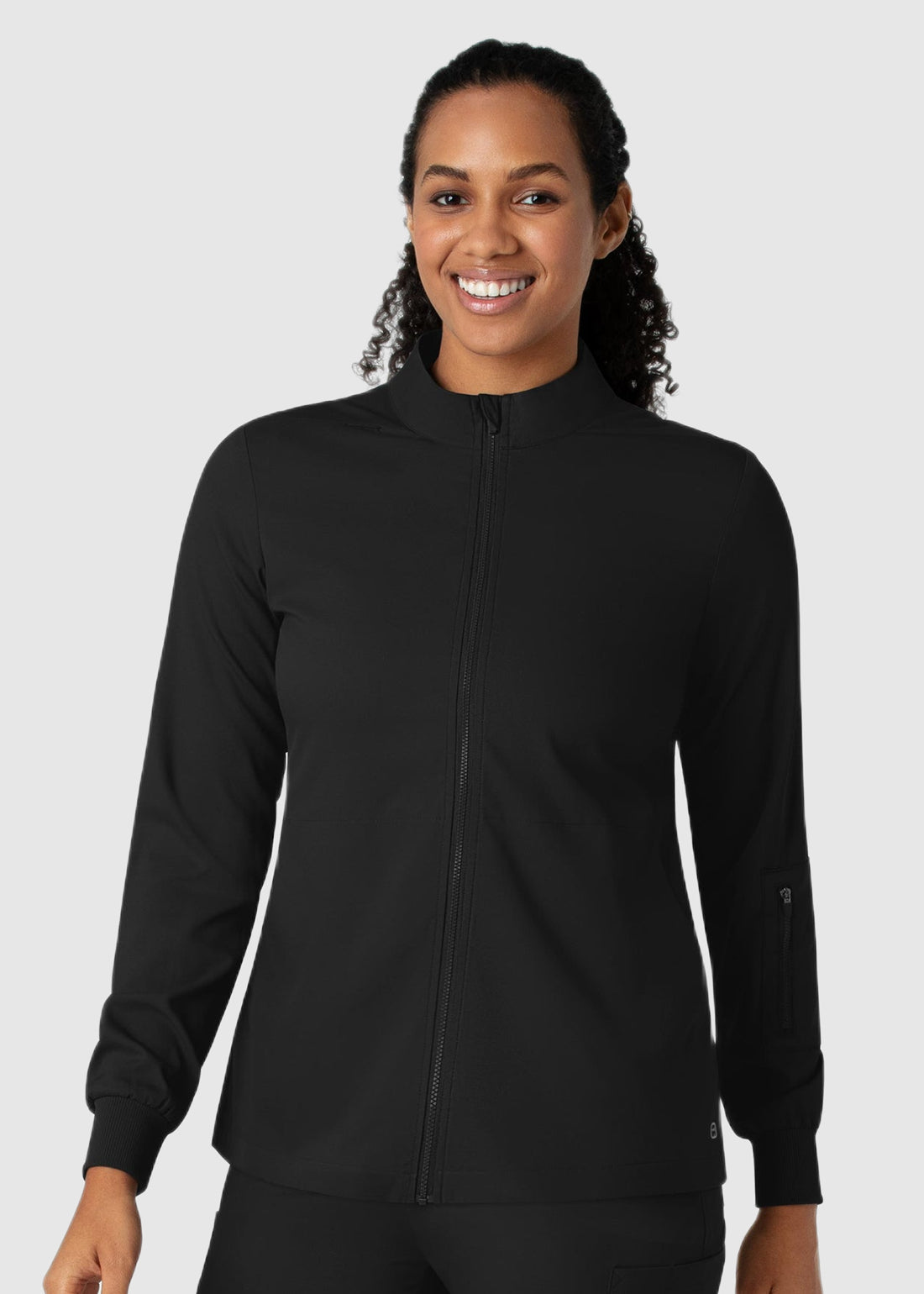Cozy and stylish with the Wink Scrubs Boundless Women's Warm Up Scrub Jacket! Designed for modern professionals, this jacket features a full zip with a mock neck and chin guard, ribbed cuffs, and multiple pockets, including an internal tablet pocket. Stretch fabric ensures comfort during your busiest shifts.