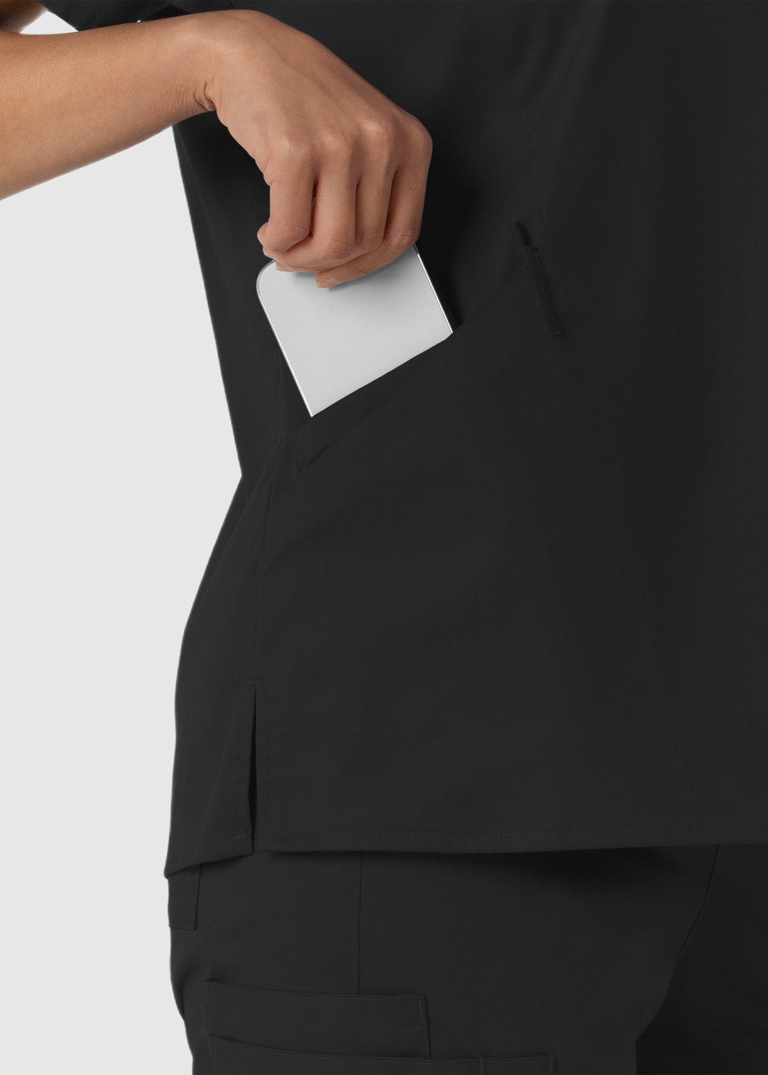 Work Women's Curved V-Neck Scrub Top offers a classic fit with a stylish and functional design. Featuring a curved V-neck with a binding finish, it includes two front slant pockets, a no-budge phone pocket, and a shoulder badge loop for convenience. Side hem vents provide added mobility for all-day comfort.