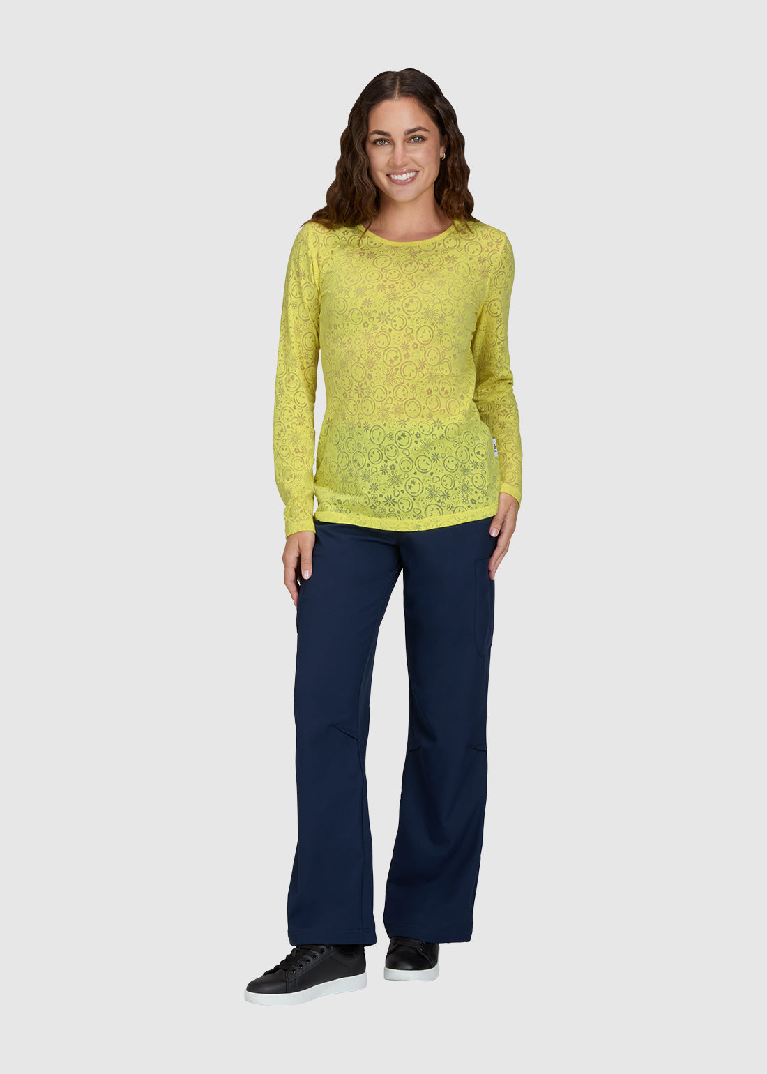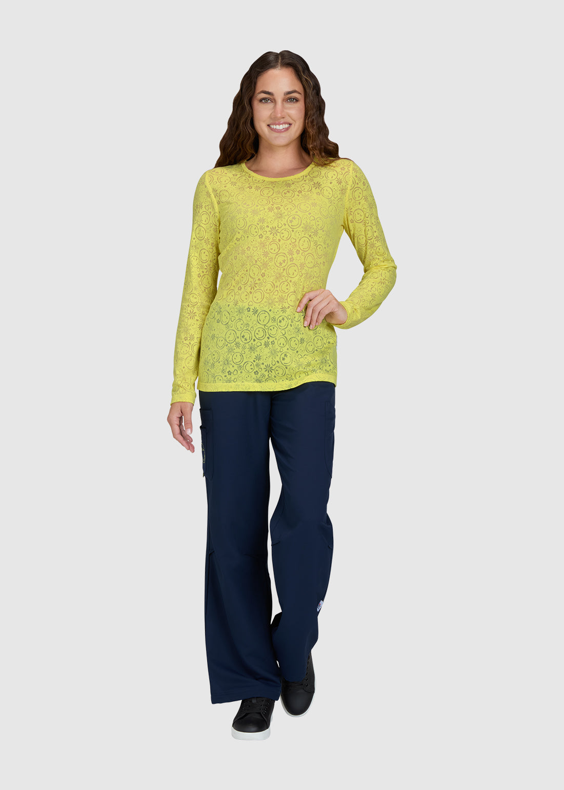 Smiley World x koi Kind Loving Yellow Women's Long-Sleeve Burnout Tee is a stylish and versatile layering piece. Featuring a subtle Smiley Face burnout design throughout, this lightweight long-sleeve tee adds a fun and trendy touch to your work or casual wardrobe.