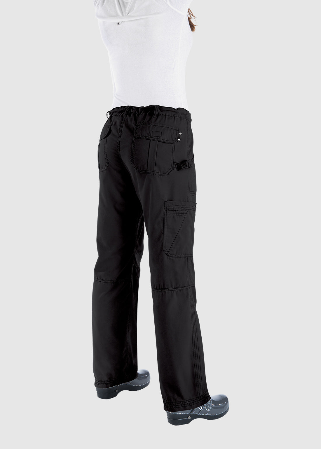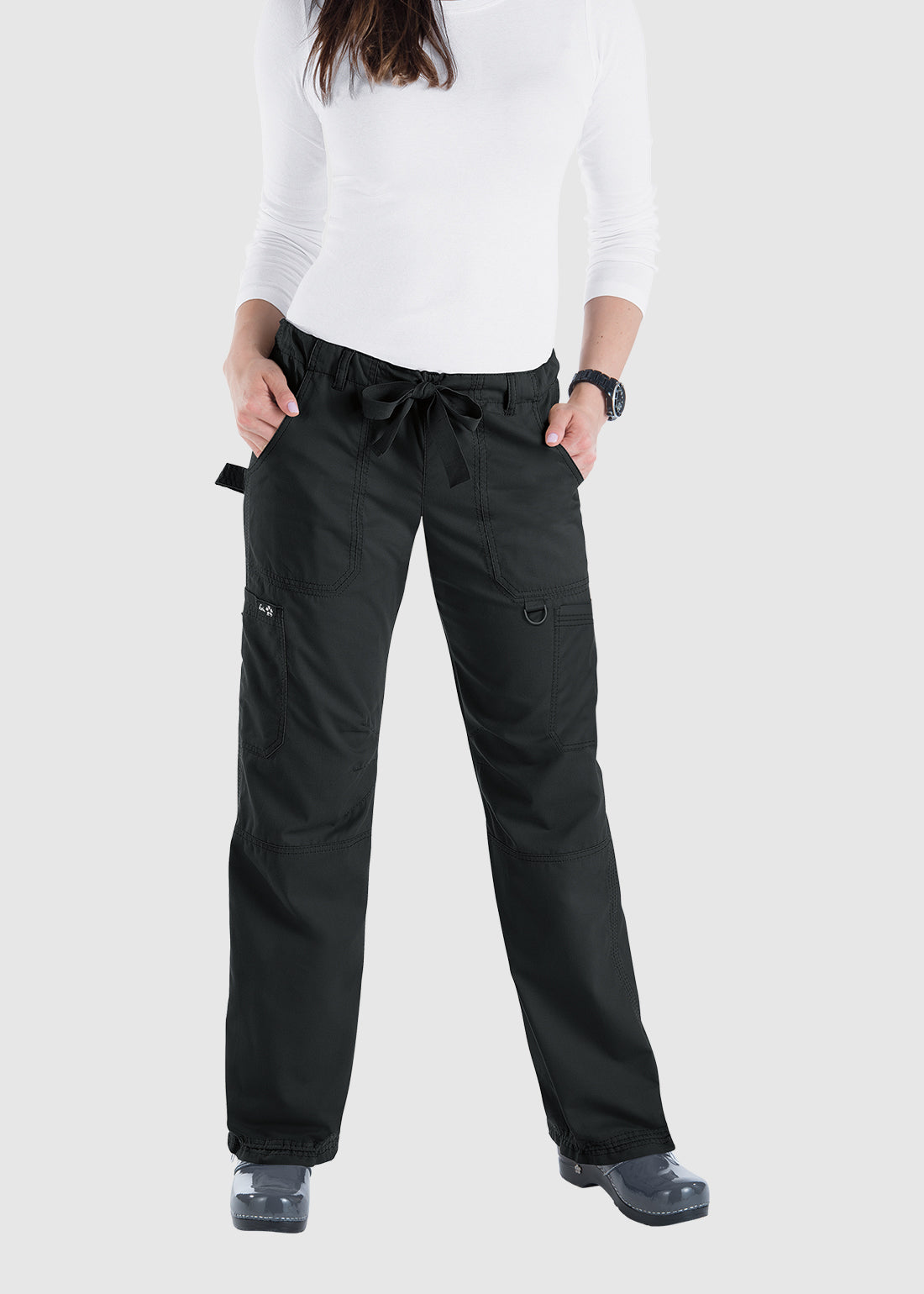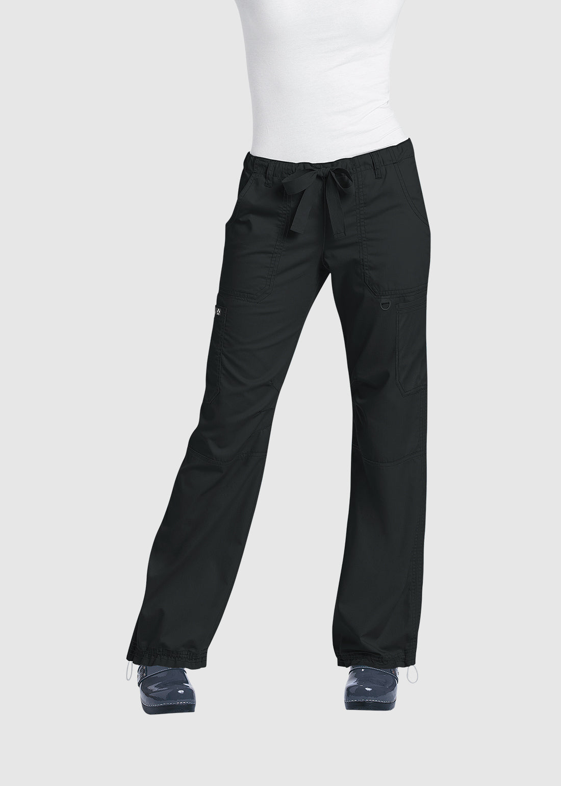 koi SmileyWorld Jubilant Women's 7-Pocket Scrub Pant offers a relaxed fit with an elastic waist and hidden drawcord for comfort. Featuring seven practical pockets, including one with Smiley Face embroidery, darts at the knees, and an adjustable cinch at the hem, these pants combine style and functionality.