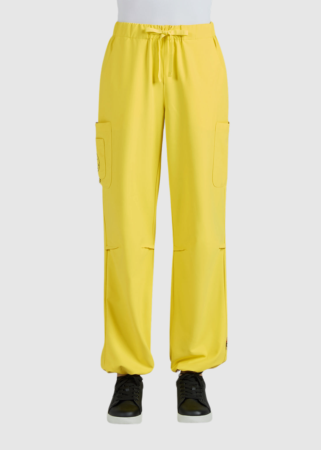 koi SmileyWorld Jubilant Women's 7-Pocket Scrub Pant offers a relaxed fit with an elastic waist and hidden drawcord for comfort. Featuring seven practical pockets, including one with Smiley Face embroidery, darts at the knees, and an adjustable cinch at the hem, these pants combine style and functionality.
