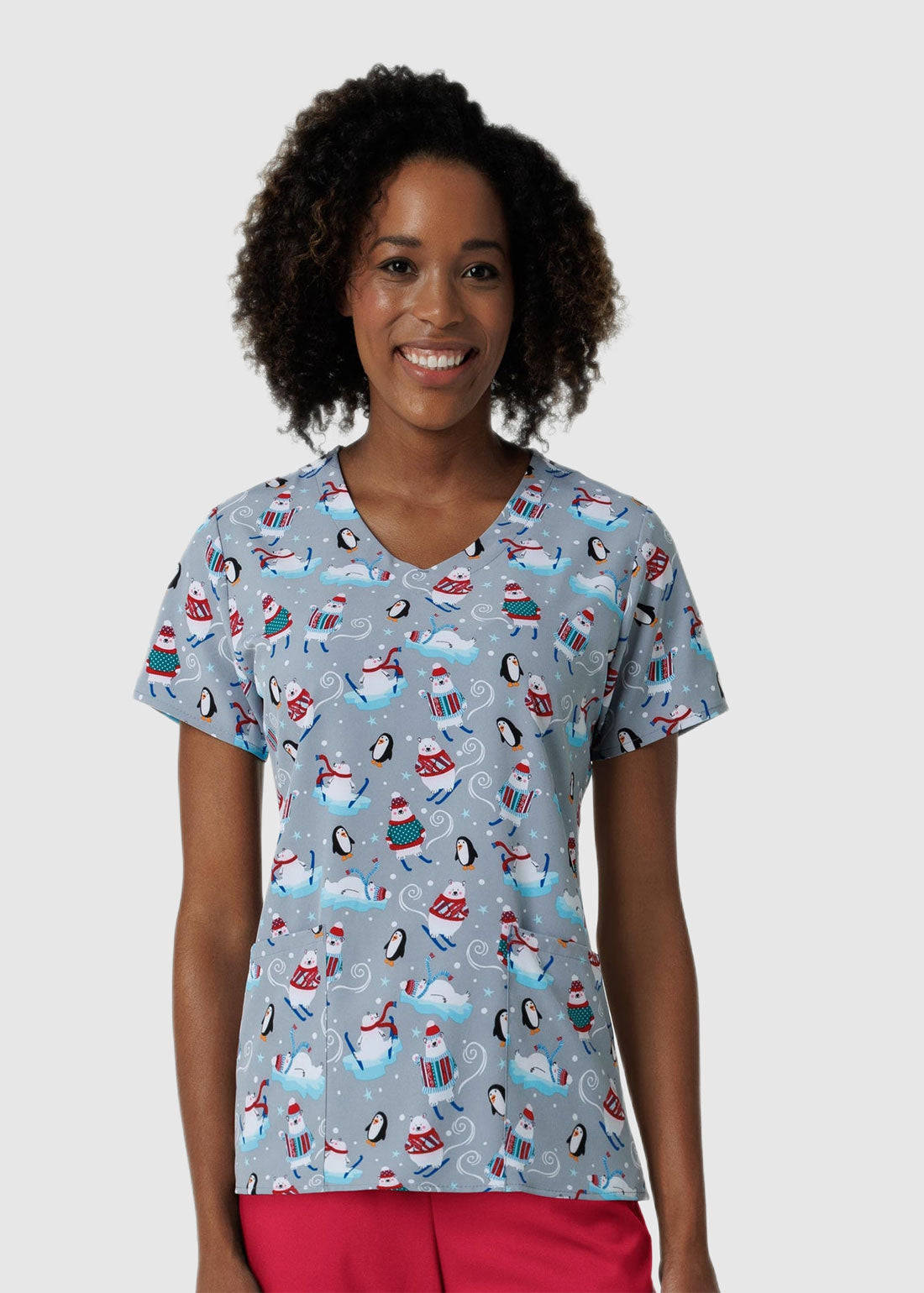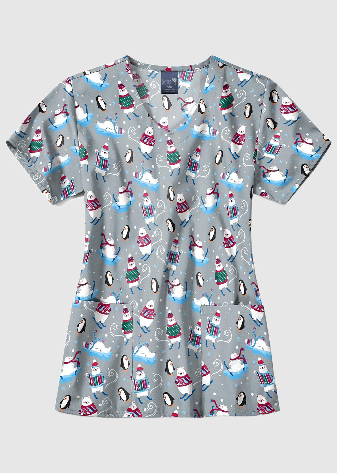 Zoe+Chloe Women's Performance V-Neck Print Scrub Top in Tis The Skison