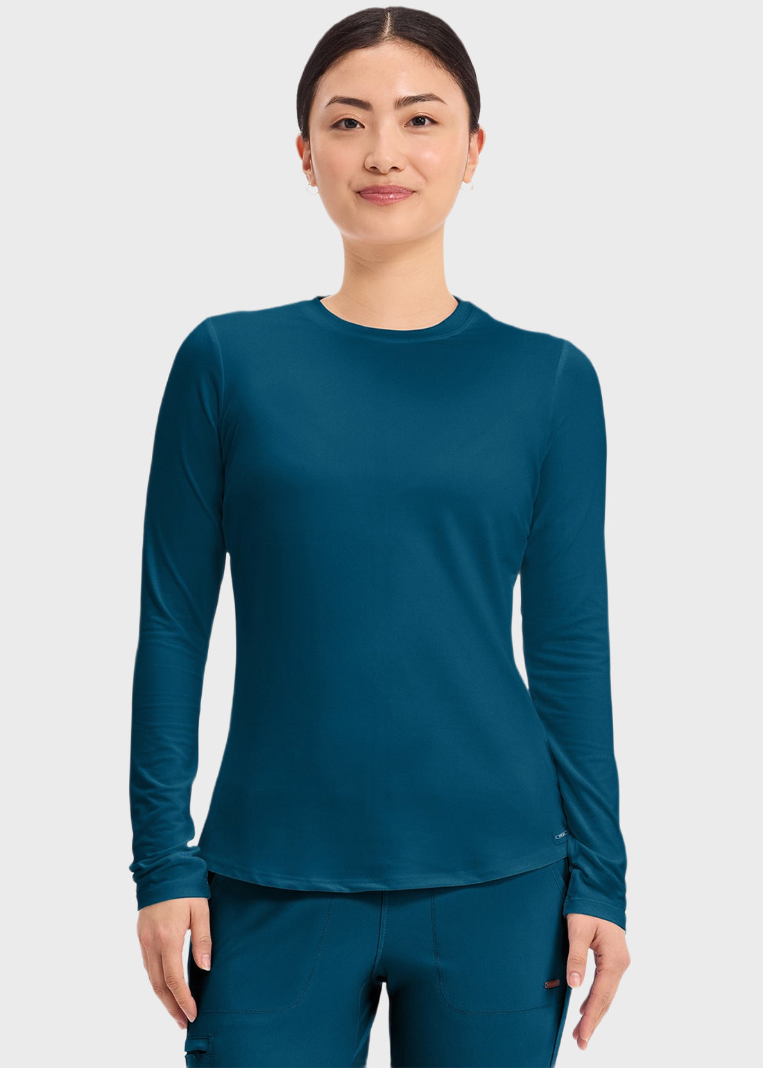 Layer up in style with the Cherokee Basics Long Sleeve Underscrub Knit Tee. Perfect for adding warmth without bulk, the classic crew neck tee is a must-have. Whether worn under scrubs or on its own, its stylish shirttail hem ensures a polished look that’s both practical and chic.