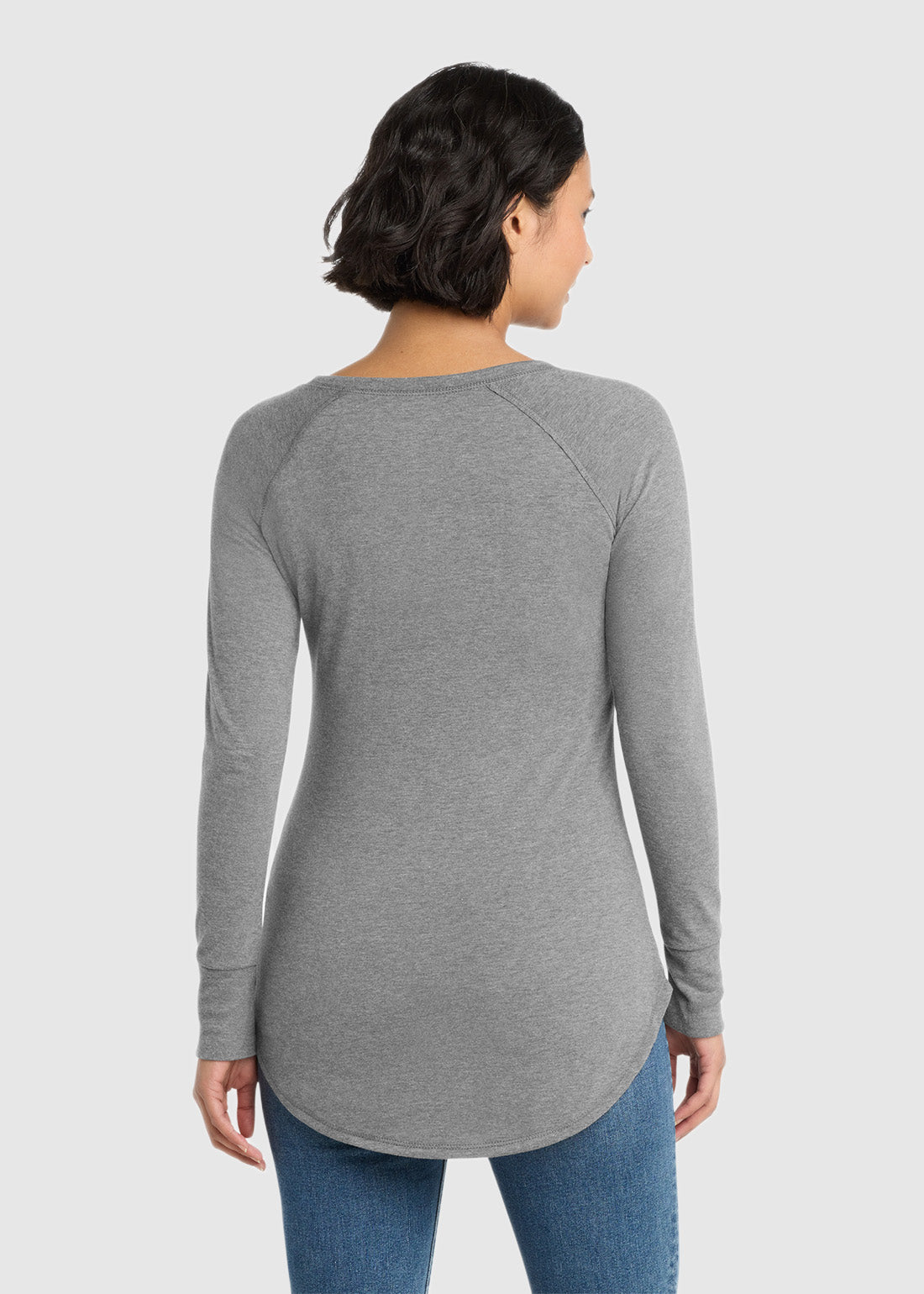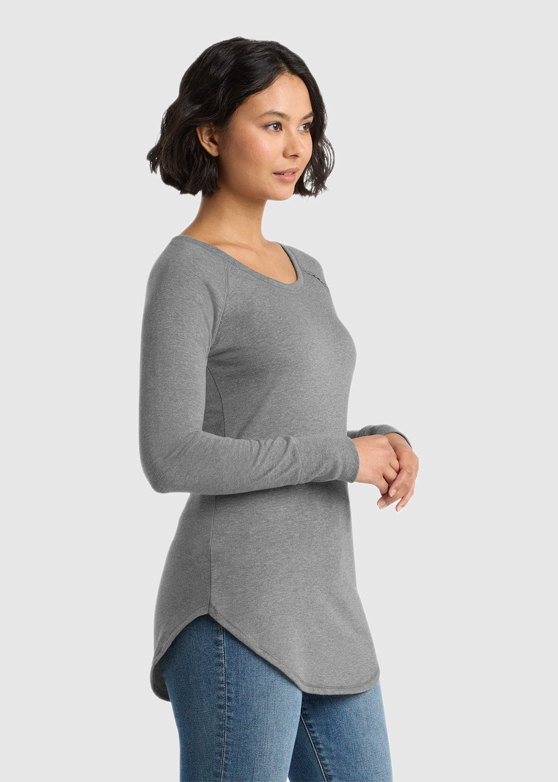 Look edgy and feel great in District Women's Perfect Tri Long Sleeve Tunic Tee. With a raw edge detail at armholes, coverstitch details, 1x1 rib knit neck, tear-away label, rib knit elongated cuffs, longer tunic length and curved hem, the tee is functional and rewarding.