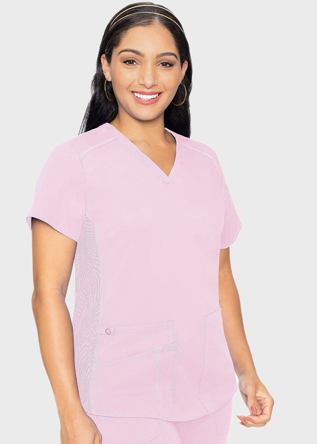 Designed to compliment your body type! The Med Couture 7459 Sporty V-Neck Top comes with a simple silhouette is enhanced with the addition of a classic shirttail hem for optimal performance. With a rib knit side panels add comfort and ease of movement while their overlapping design adds an athletic touch. completed wth spacious pockets, the top is great value for money.