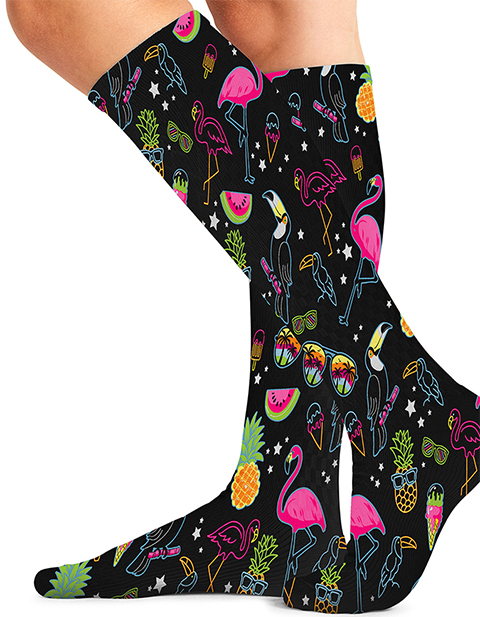 Cherokee Knee High Compression Sock in Flamingo Party Add a pop of fun to your step with the Flamingo Party compression sock. This single pair offers comfortable, durable, and lightweight support, featuring vibrant sublimation printing for bold, long-lasting color.