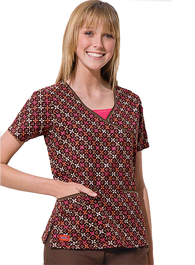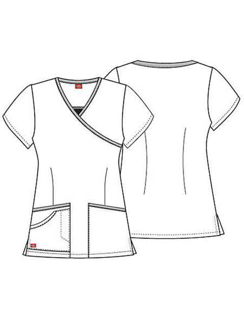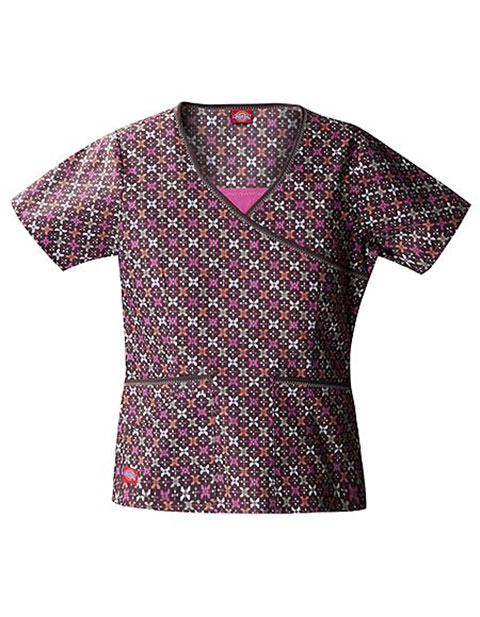 It is easy to be efficient and stylish with this scrub top from Dickies Uniforms. It has a mock wrap style and printed with “Coral Gables” design. This fashion scrub top features a contrast trim at the neck and pockets with fashion stitch detail. Also added are two roomy front patch pockets and one shaped accessory pocket to easily keep your important tools and other personal items. The center back length is 24 inches, and the fabric is composed of 100% cotton.